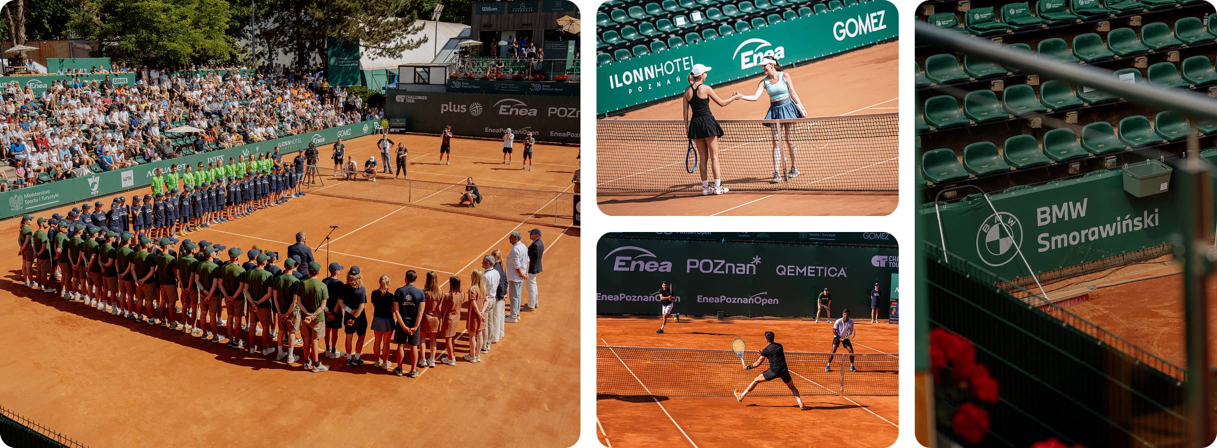 Trybuny kortu centralnego: nazwa kortu z wpisaną nazwą partnera (także podczas Enea Poznań Open) oraz ekspozycja logotypów na bandach reklamowych.